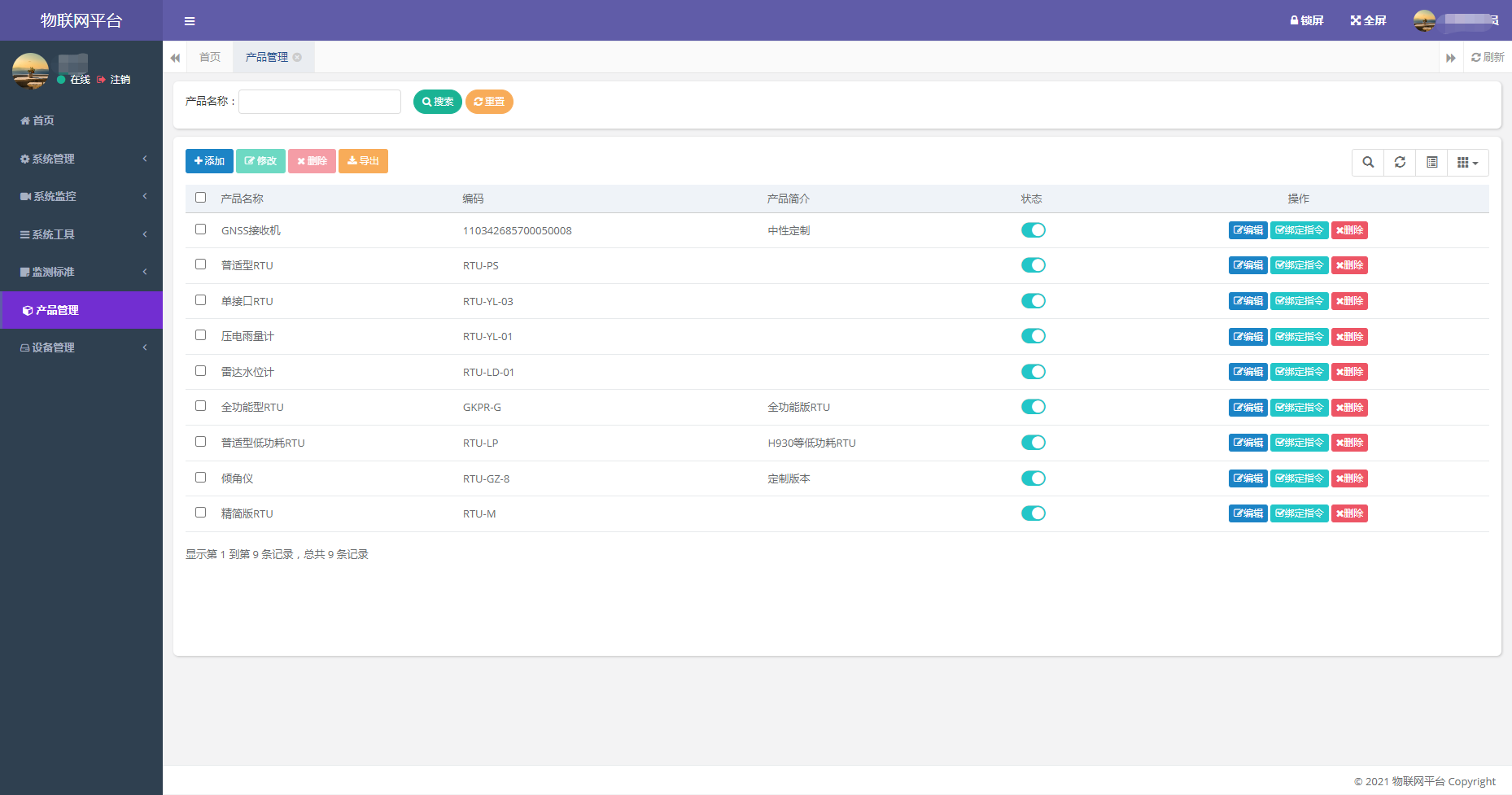集成我公司所有自动化监测产品管理,不同产品对应接入协议、操作指令所有区别