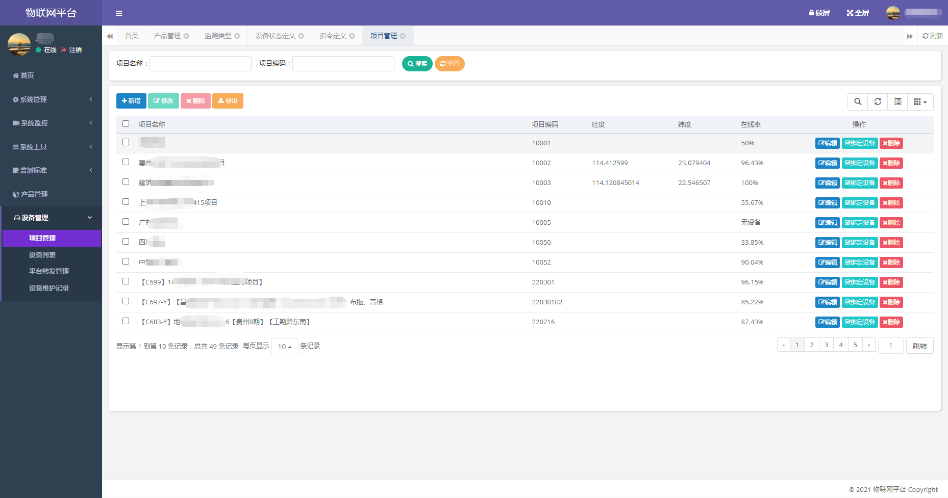 通过项目管理批量绑定设备,方便按项目统计设备在线率、运行状态等情况