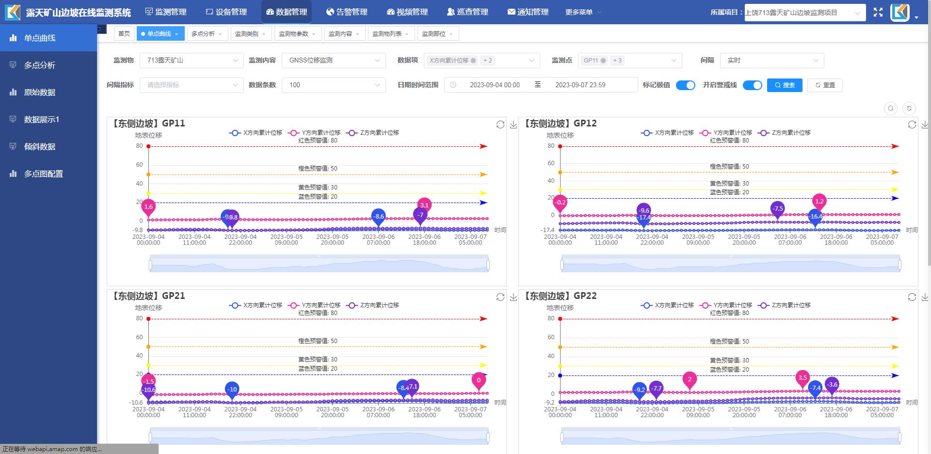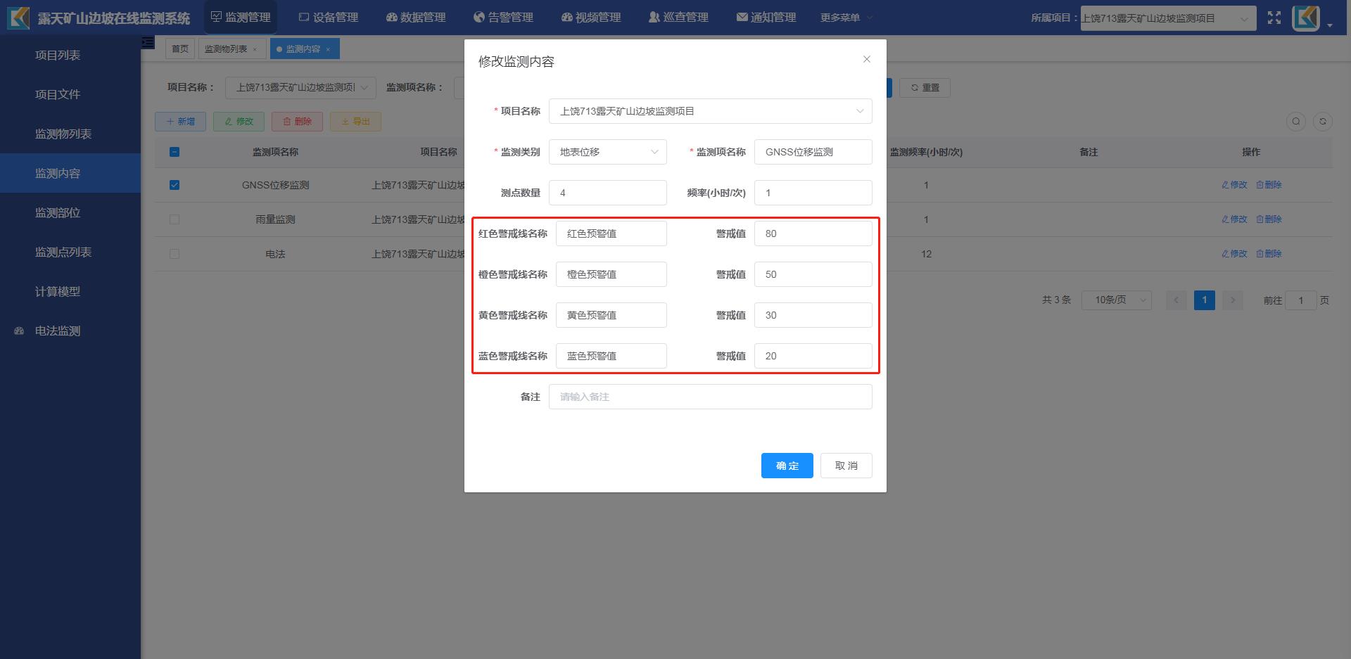我公司针对露天矿山边坡监测提供完整的监测实施方案,包含规范要求的各类监测设备、监测平台、现场建设等全链条服务。监测内容涵盖表面变形、视频图像、内部变形、应力、地下水、爆破振动、降雨量等,表面变形和视频图像为必须监测项目。监测平台具备完善的露天矿山边坡监测系统管理功能,包含矿山管理、监测项管理、预警管理、文件管理等模块,根据预警严重程度分为四级预警机制,具备完整的预警响应处理机制,并纳入应急预案。